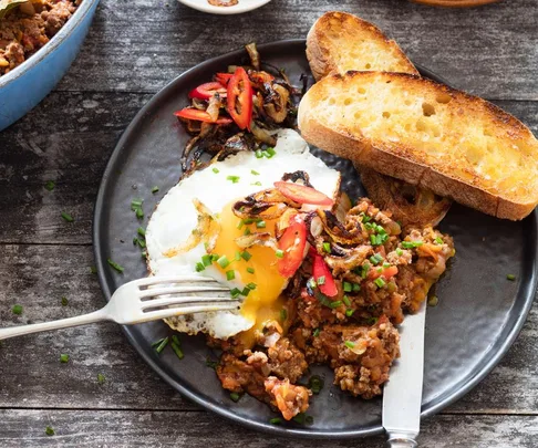 Hearty and delicious, Nici Wickes’ mince on toast recipe is a great start to the day. It’s made that little bit more fancy than your classic version with chilli, onions and a perfectly fried egg