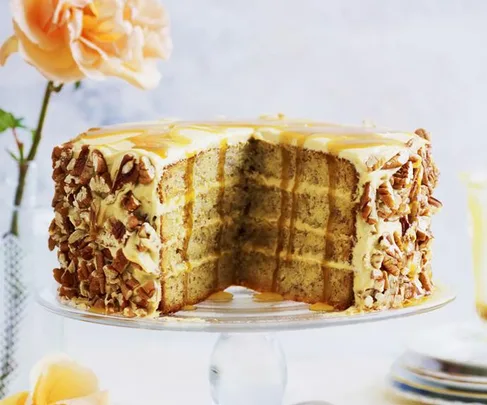 For the perfect sweet treat, enjoy a slice of this fluffy banana and hazelnut cake drizzled in hot butterscotch syrup.