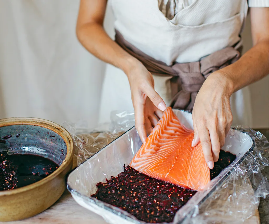 Take dish with salmon fillet out of the fridge. Unwrap cured salmon and scrape clean of beetroot salt mixture with a spoon. Take care with beetroot, as it will stain. Lift salmon onto a piece of baking paper; discard beetroot salt cure.