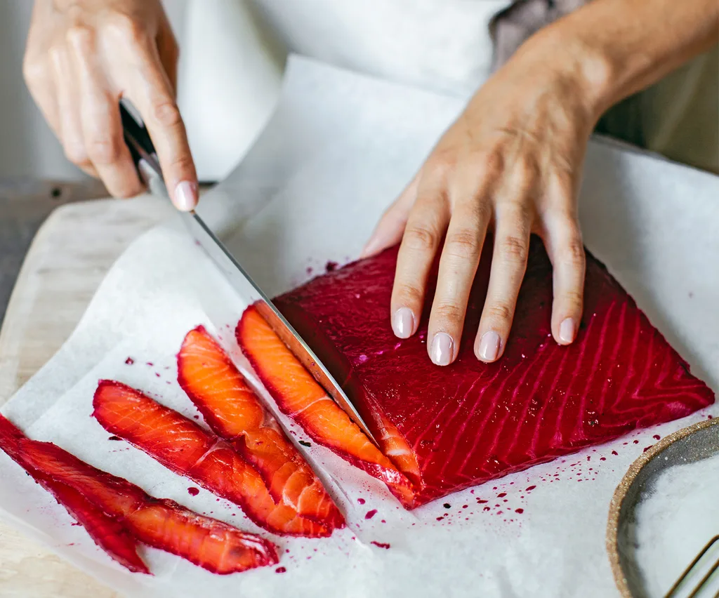 Thinly slice cured salmon fillet with a sharp knife and serve with Pickled beetroot and the Root vege slaw.