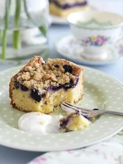 5.Spoon the mixture into the prepared pan. Scatter over the blueberries and then sprinkle over the topping.