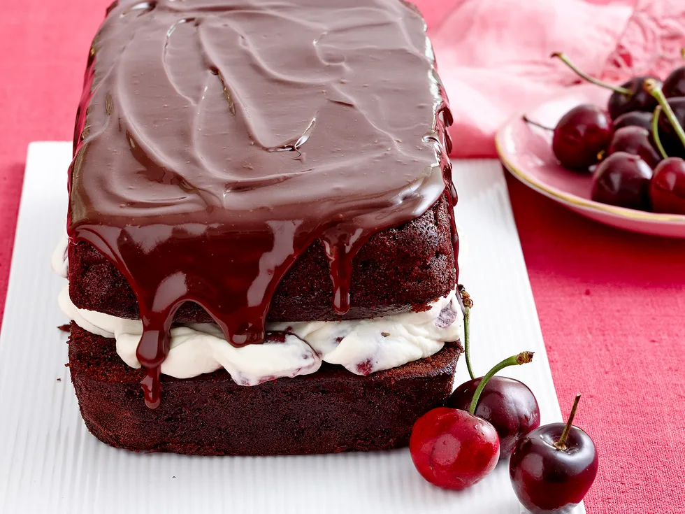 6.Trim rounded rounded tops off each cake so that they are flat. Position one cake on serving platter. Top with cherry cream and sandwich tother with remaining cake. Spread ganache over top.