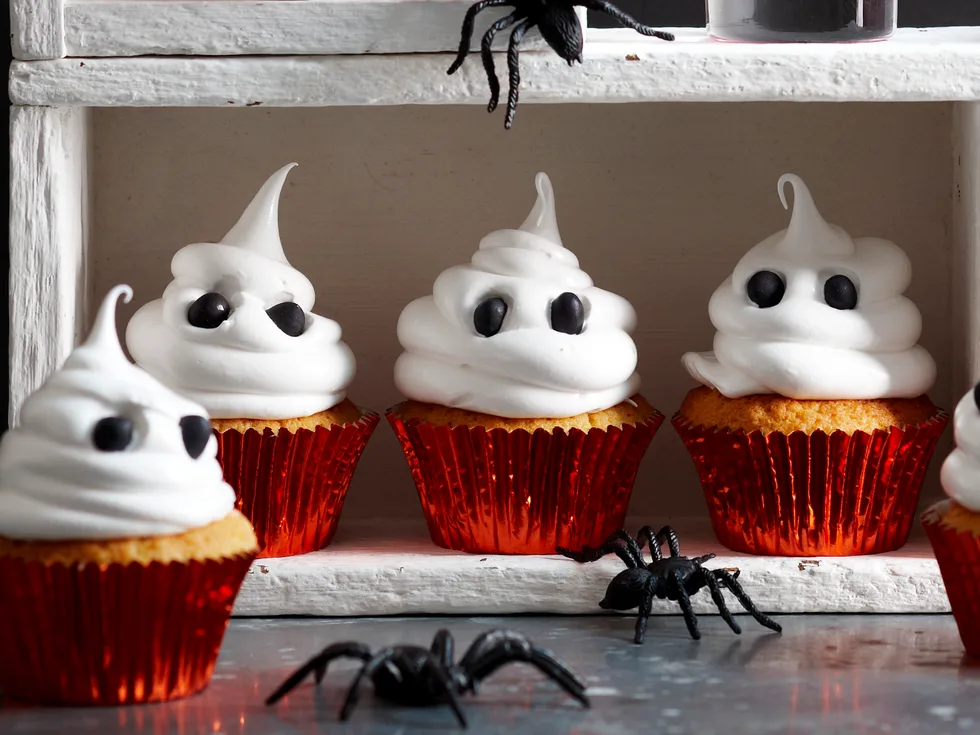 For spider drinks, half fill tall glasses with fizzy creaming soda. Then add a scoop of vanilla ice cream to each and watch them foam. Use ready-made cupcakes to save time if preffered.