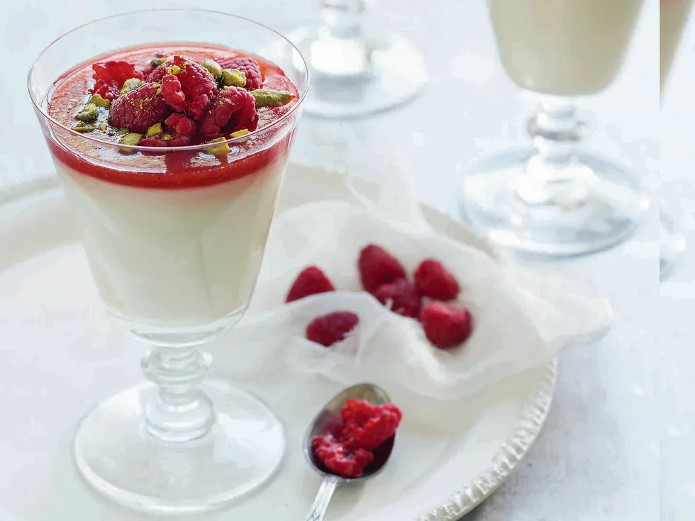 4.Make sauce: put the raspberries and sugar in a food processor or blender and purée until smooth. Pass through a fine-mesh sieve to remove the seeds. Put the liquid in a small saucepan over low heat and bring to the boil. Simmer for 5 minutes then remove from the heat. Add the rosewater, stir and allow to cool.