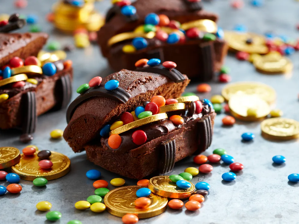 4.Attach M&Ms to licorice straps using frosting and allow to set. Fill chests with frosting, coins and remaining m&ms.