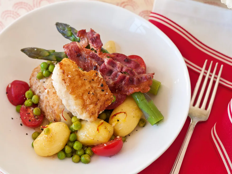 9.Dish up the potatoes and peas, top with the fish, surround with the onion and tomatoes, and drape with the asparagus and pancetta. Serve immediately.
