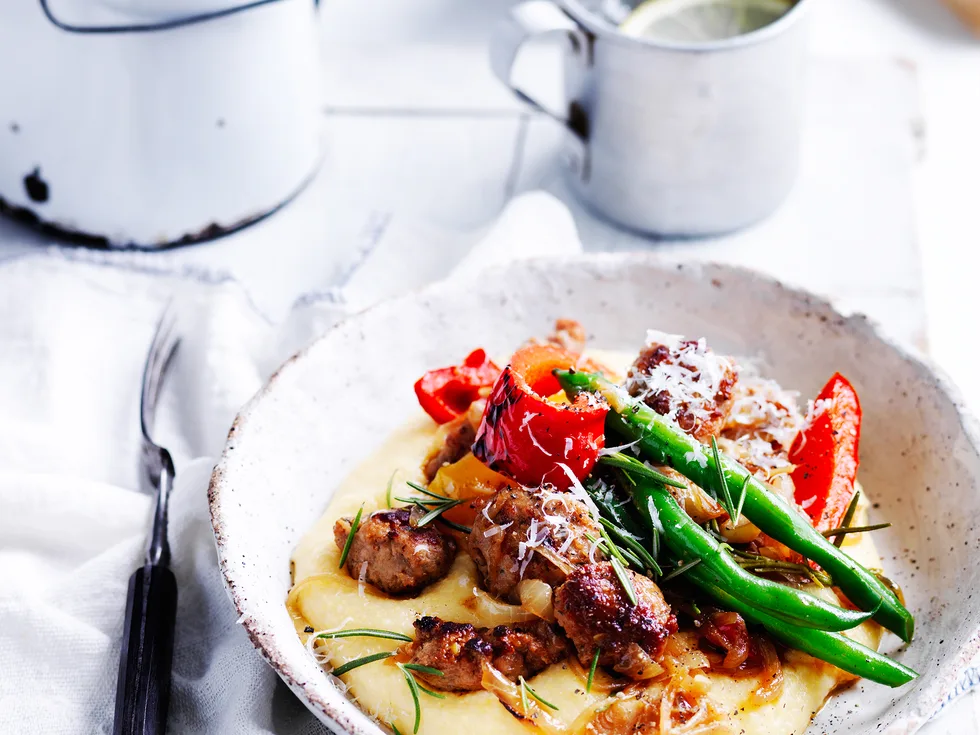 We used a riesling-style dry wine in this recipe. Use one red and one yellow capsicum, if you like. This dish would also be nice with beef or chicken sausages. Serve with potato mash instead of polenta.