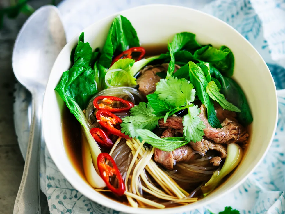 Replace the baby pak choy with your favourite Asian green. For a little extra heat, slice a small red thai (serrano) chilli and add it to the soup with the herbs. If you prefer chicken, replace the beef stock with chicken stock and the beef with sliced chicken breast.