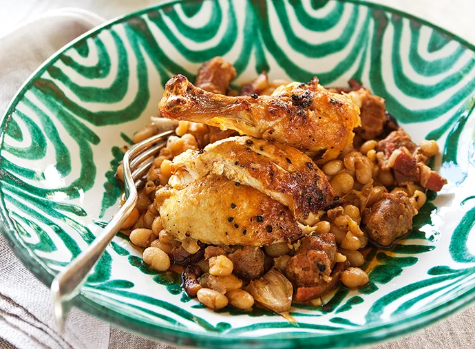 4.To serve, lift the chicken onto a clean plate and cut into portions. Divide the flavoured beans between serving plates and top with pieces of roast chicken and remaining pan juices.