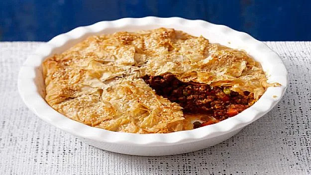 4.Spoon mince into dish, then fold the edges of filo over mince to enclose. Brush with butter and sprinkle with sesame seeds.
