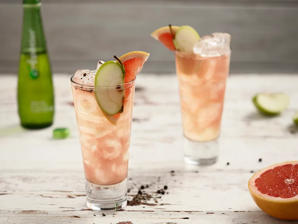 3.Garnish with a grapefruit and apple wedge plus a pinch of black pepper.