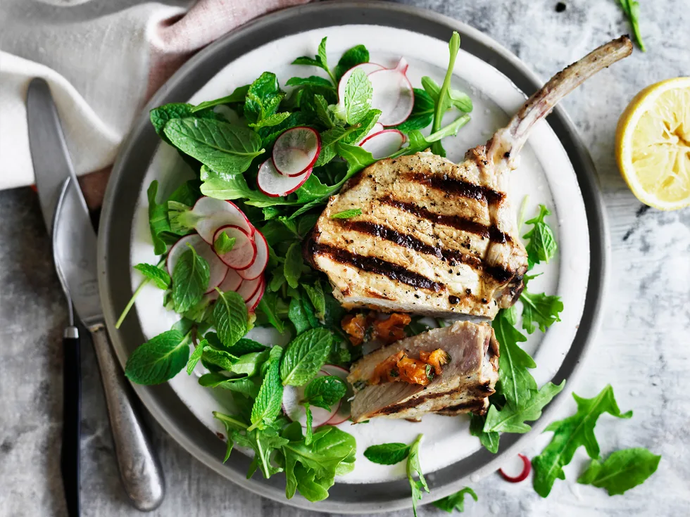 Apricot and mint stuffed pork with rocket, mint and radish salad