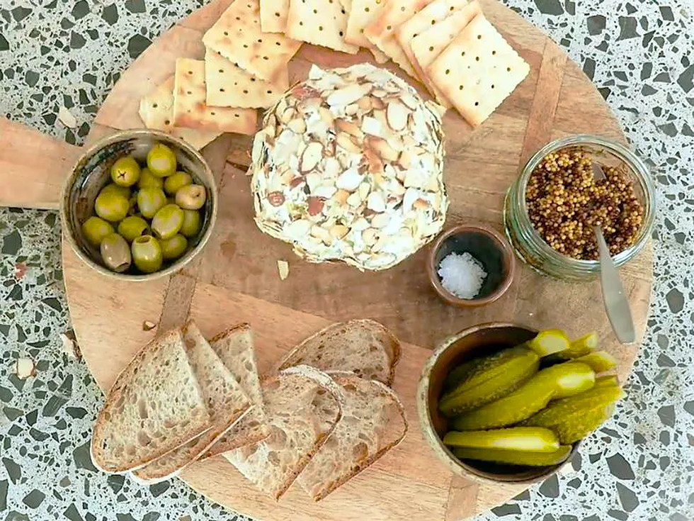 3.Remove cheeseball ingredients from fridge and roll into a ball. Coat liberally with toasted almonds.