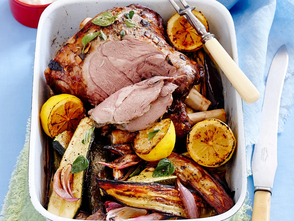 4.Cover lamb with foil. Bake for 1 hour. Add zucchini, eggplant, red onion and extra halved lemons to pan. Toss in juices and season.