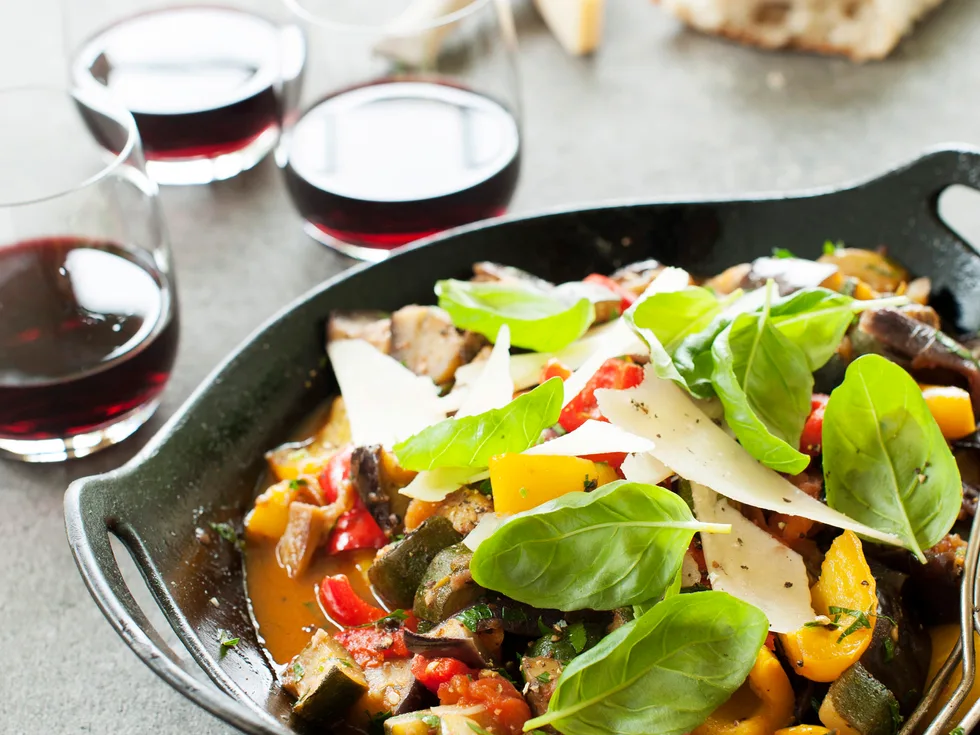 3.Heat remaining 2 tablespoons oil and fry eggplant chunks until golden. Return the other fried vegetables to the pan and add chopped tomatoes, herbs, garlic and sugar. Season to taste, cover with a lid and cook over a moderate heat for 15 minutes.