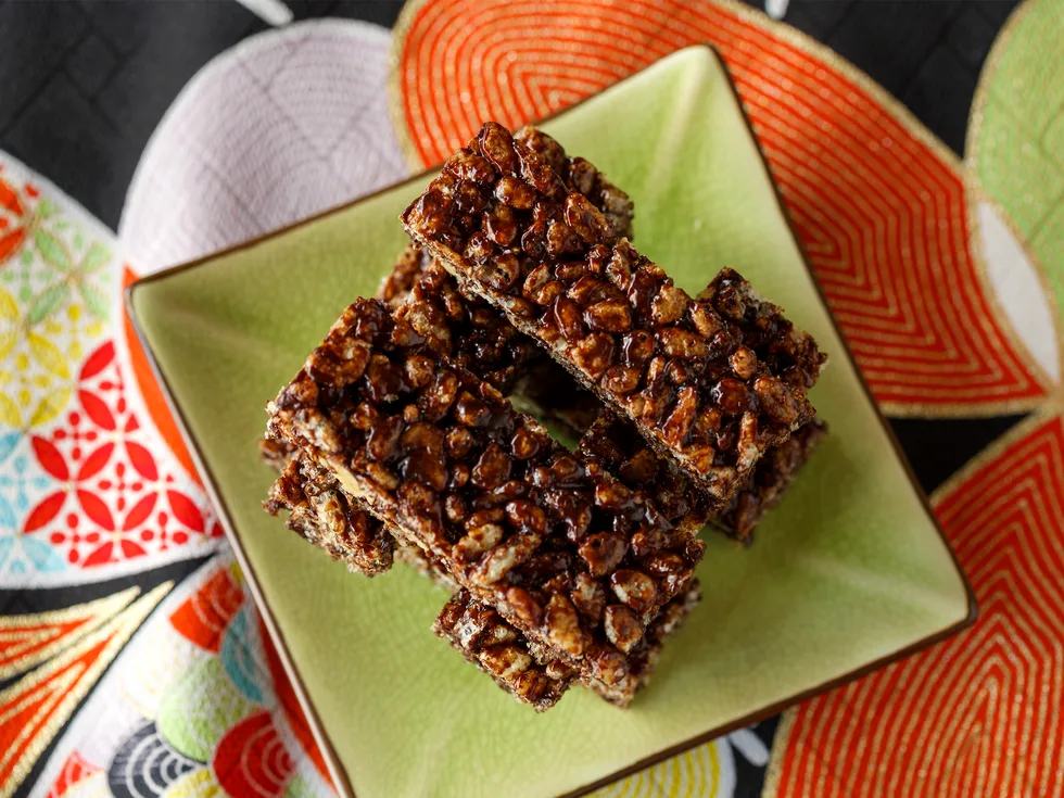 4.After 3 minutes, remove the pan from the heat and add the vanilla followed by the rice bubbles. Mix everything together quickly and press evenly into the prepared tin. Leave for a few minutes to cool a little and then cut into neat fingers. (The mixture sets firmly almost immediately.)