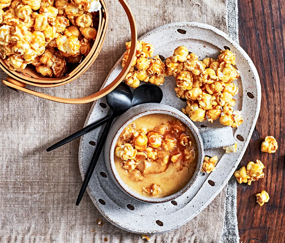 3.Top each mug with a handful of caramel popcorn, then drizzle with reserved caramel.