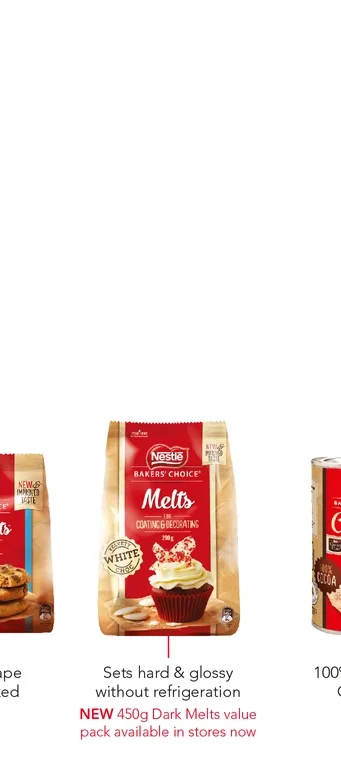 The delicious improved chocolate baking range NESTLÉ BAKERS’ CHOICE is made for baking, helping Kiwi bakers to celebrate the wonderful, comforting qualities of chocolate. Designed to produce reliable baking results every time, NESTLÉ BAKERS’ CHOICE helps passionate bakers perform at their best. The range can be found in leading supermarkets near you. Available in leading supermarkets with a NEW 450g Dark Melts Value Pack.