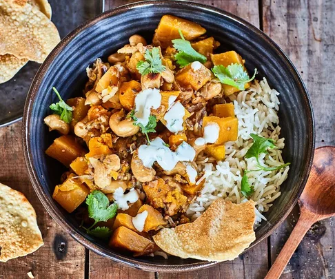 This pumpkin and cashew curry is so incredibly moreish! The cashews soften to a light crunch on cooking and the mix of spices forms the perfect background for the pumpkin.
